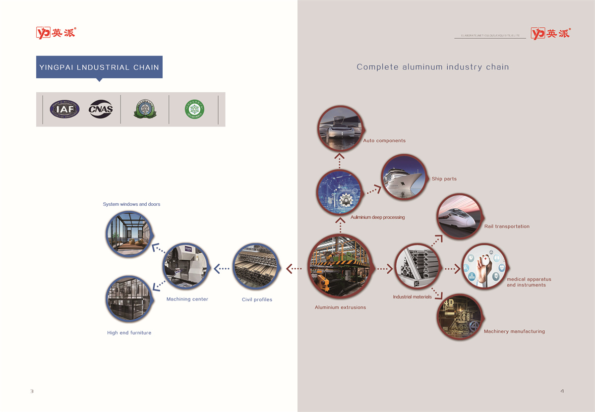 Yingpai Industrial Co., Ltd. is a full chain enterprise with modern production technology, specializing in research, development, production and sales of aluminum alloy decoration, construction, industrial and aluminum products finishing products. It has advanced aluminum profile extrusion production line, powder spraying production line, color oxidation production line, crystal swimming production line, aluminum products deep processing workshop, arc bending and aluminum welding workshop. From the surface treatment of aluminum profile extrusion, machine polishing, sand blasting, wire drawing, color oxidation, powder spraying, crystal swimming, etc. to the finishing of aluminum products, machining, arc bending, welding, etc., there is a perfect aluminum profile processing and production process. The products are widely used in furniture, decoration, doors and windows, rail transit, shipping, auto parts, power, electronic appliances, machinery manufacturing and other fields.